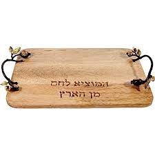 This challah board features copper handles decorated with golden grapes and leaves. This gorgeous board is perfect for any home!